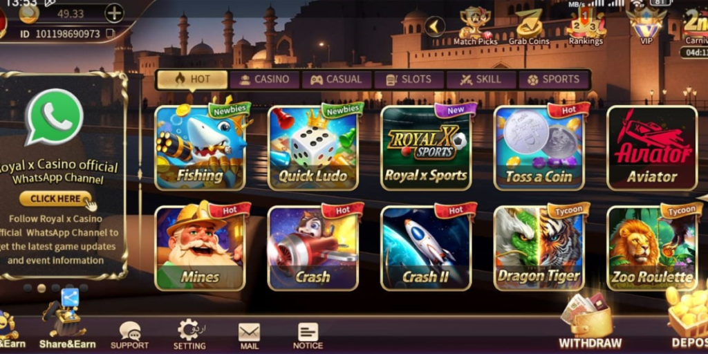 The RoyalXcasino Game is a mobile casino-style application made for Android users. It allows players to enjoy different types of games like slots, spins, and prediction-based games. The main purpose of the app is to provide entertainment along with chances to earn rewards.